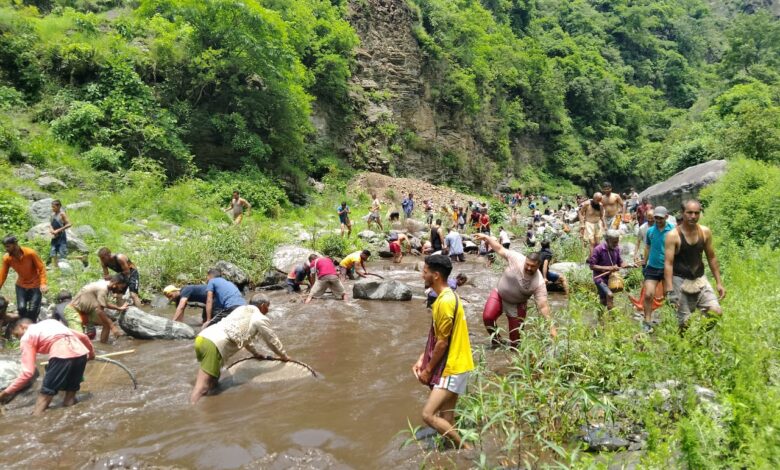 नैनवाग के बद्रीगाड नदी में भरुवा मौण मेले में ग्रामीण ने पकड़ी मच्छी