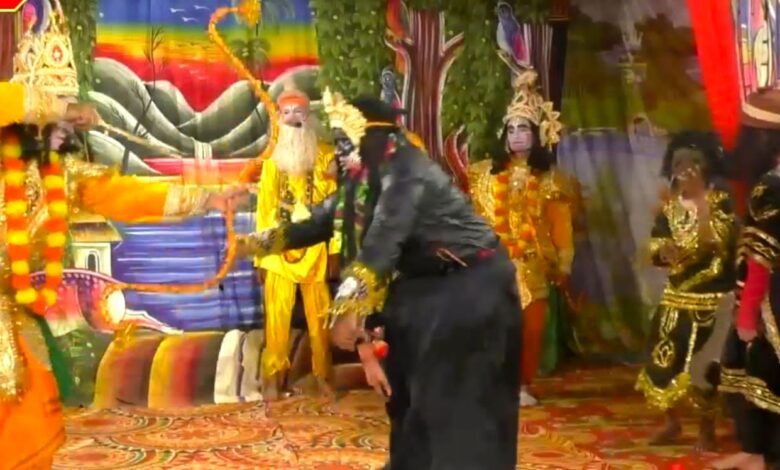 थत्यूड में आयोजित में रामलीला में श्रीराम द्वारा ताडका व सुबाहू का वध